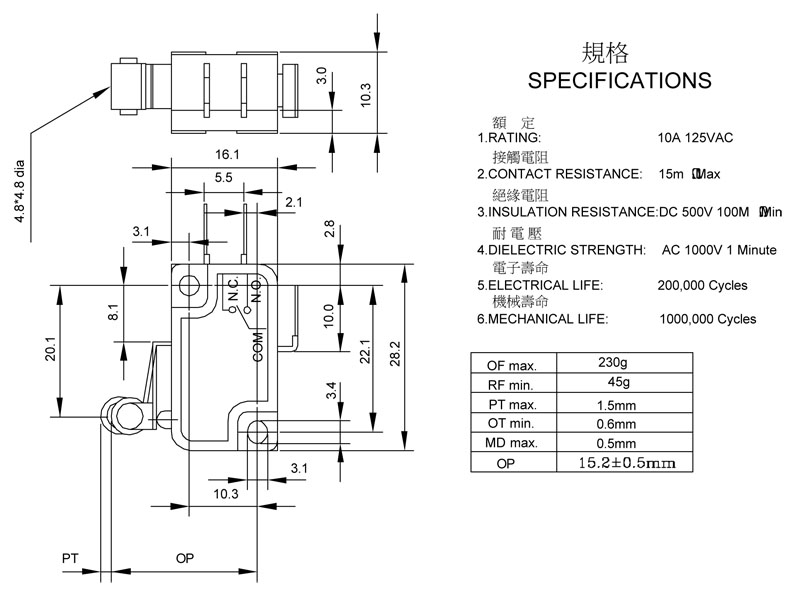1. 額定:AC 125 V 0.2 A DC 30 0.2 A